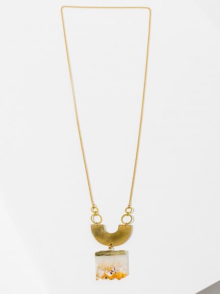 A unique slice of raw citrine complemented with brass components hang from matte gold chain. Necklace 30 inches long with no clasp. Made in USA.