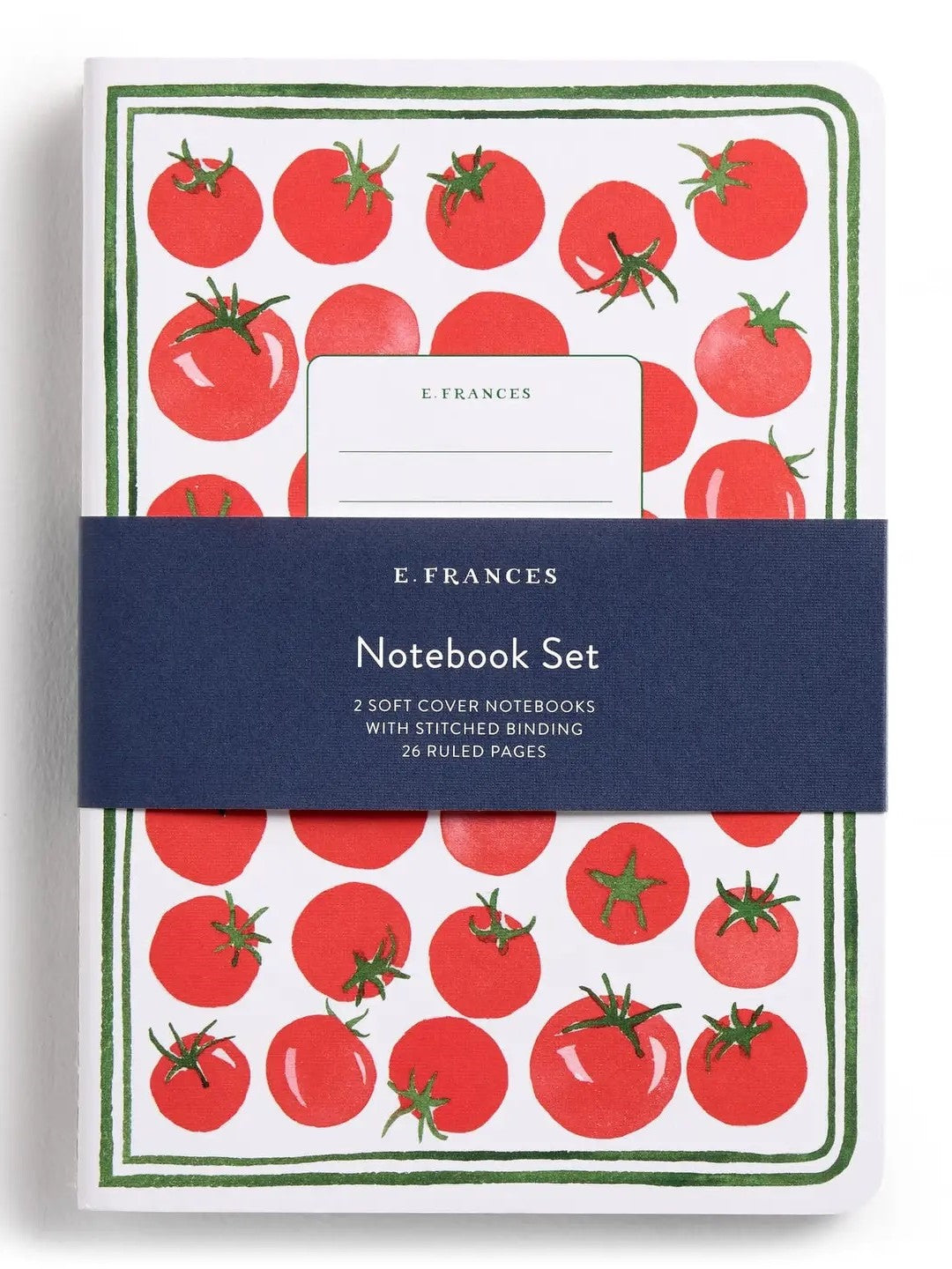 These stitched-binding notebooks feature soft covers and classic lined pages inside. One bursts with bright, cheerful tomatoes framed in green; the other showcases a delicate gardening motif filled with leafy vines and whimsical garden details.